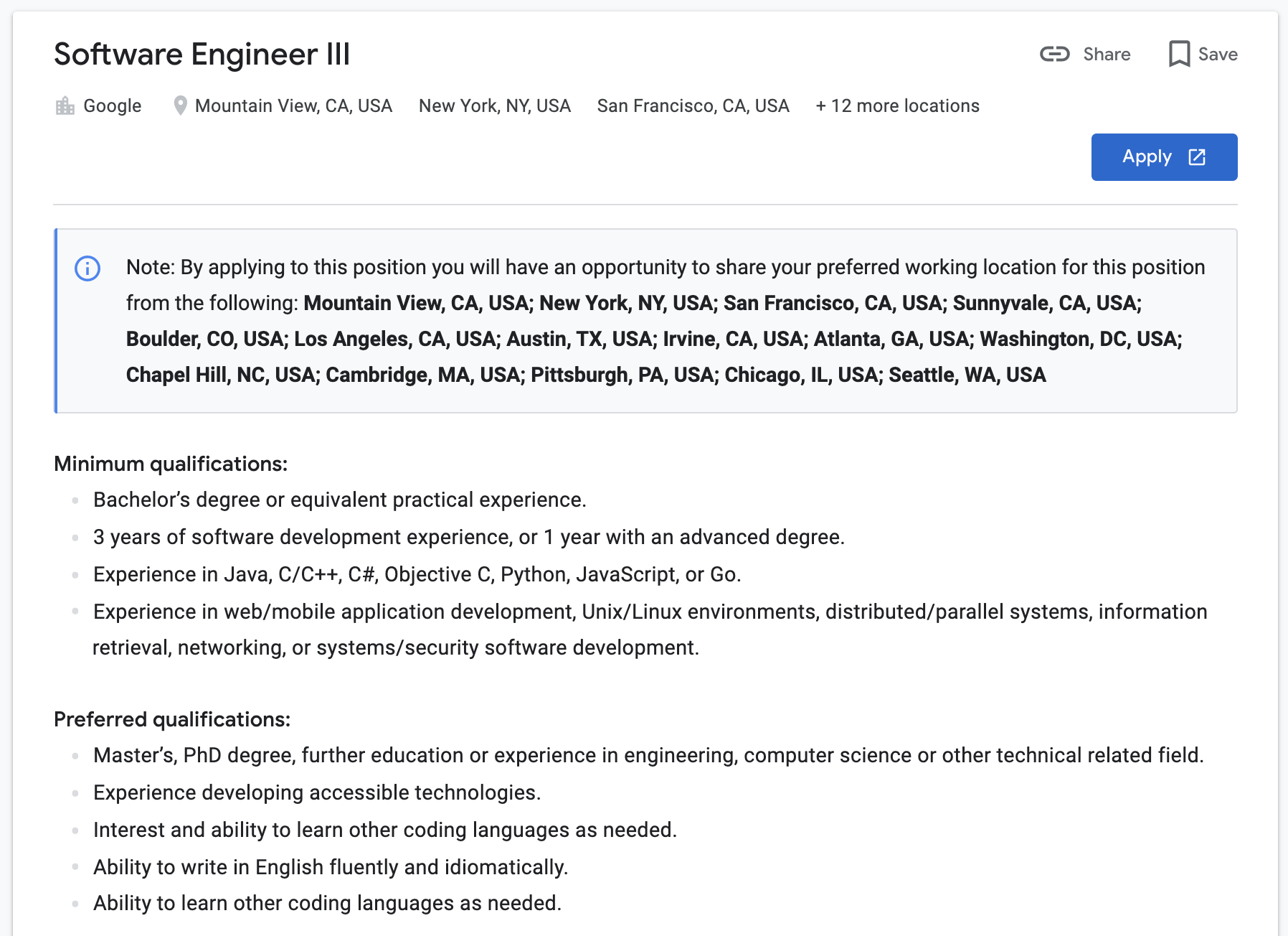 개발자로 취직하고자 하는 분들께 제가 가장 추천하는 학과는 CS입니다. 그저 아무것도 붙지 않고 Computer Science라는 이름을 가진 학과가 가장 넓은 취업 시장을 가지고 있습니다. 구글에서 올라오는 잡 포스팅을 살펴봅시다. 제가 아래 software engineer 채용 포스팅 스크린샷을 하나 가져왔습니다. "Preferred qualifications"의 첫 문장이 보이십니까? Degree in "computer science or other technical related field"라고 명시하고 있습니다. 다시 말해, 당신의 학위가 Master of science in computational statistics 였다면, 당신은 그게 진짜 computer science에 관련되어 있는지 (other technical related field인지) 다시 한번 증명해야 합니다. 그러나 Master of science in computer science 라면, 굳이 그럴 필요가 없겠죠.