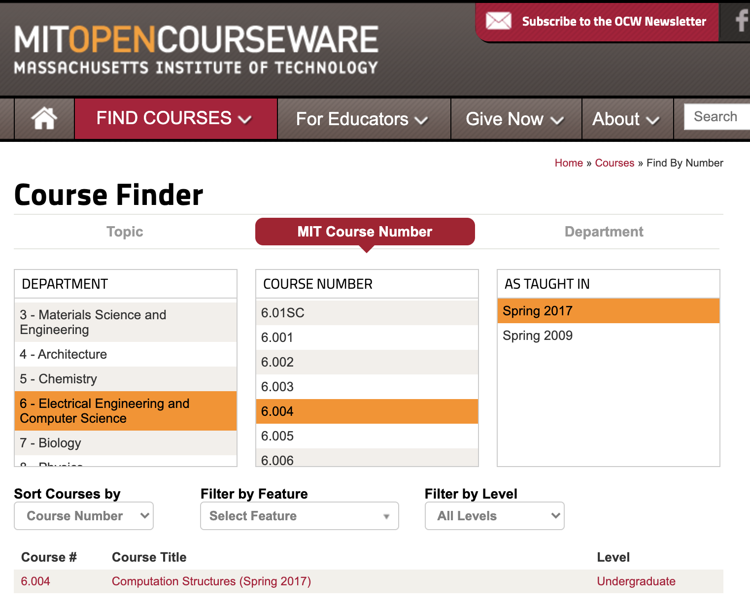 한 가지 팁을 더 드리자면, 코스 번호와 이름을 구글에 검색해 보세요. 예를 들어 6.004 Computation Structures 라면 "MIT 6.004"라고 검색하는 거죠. 가끔씩은 강의 홈페이지에 들어가 볼 수 있는 경우들이 있습니다. 운이 좋으면 OCW에 등재되지 않은 과목 페이지들도 찾고, 해마다 조금씩 달라진 실라버스와 강의 내용을 확인할 수 있습니다. 혹은, 알고리즘(Algorithm)처럼 어느 대학에서나 가르치는 과목일 경우 MIT 뿐만 아니라 다른 대학 과목 홈페이지도 찾아볼 수 있습니다. 예를 들어, "Stanford Algorithm" 이런 식으로요. 여기서 한 발짝 더 나아간다면 MIT가 아닌 다른 학교 정보를 찾아 제가 소개드렸던 방법을 그대로 따라 해 볼 수 있겠죠. 그 학과의 커리큘럼을 확인하고, 과목 정보를 찾아서 확인해보시면 됩니다. 제가 MIT 커리큘럼을 기준으로 설명드린 것은 제가 가장 잘 아는 것이기 때문일 뿐입니다.